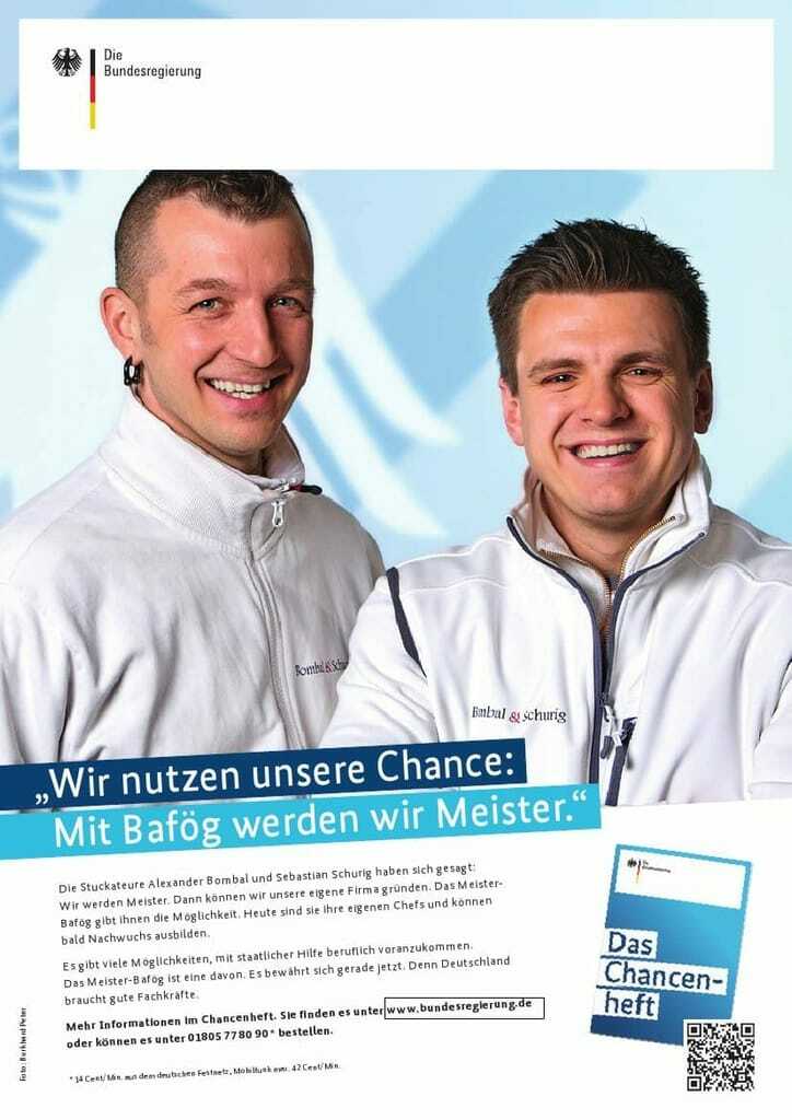 Um dafür zu werben, haben sich die Verfasser ganz besondere Protagonisten ausgewählt: Handwerker. So zeigen die Stuckateure Alexander Bombal und Sebastian Schurig auf einem Plakat mit lachenden Gesichtern, dass es dank dem Meister-Bafög geschafft haben, eine eigene Firma zu gründen. "Heute sind sie ihre eigenen Chefs und können bald Nachwuchs ausbilden", heißt es auf dem Plakat zum Chancenheft. dhz