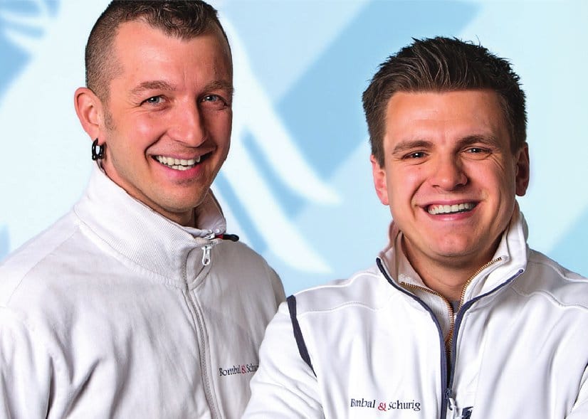 Die Stuckateure Alexander Bombal und Sebastian Schurig werben für das Meister-Bafög. Die Bundesregierung informiert im neuen Chancenheft darüber. - © Foto: Bundesregierung
