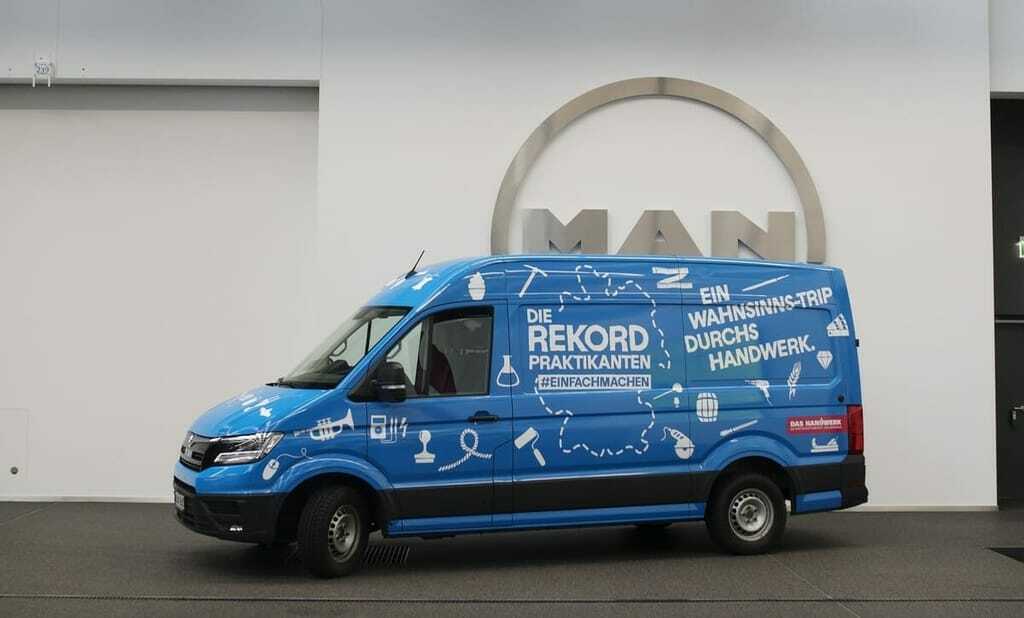 Unter der Schirmherrschaft des Zentralverbands des Deutschen Handwerks (ZDH) versuchten sie sich unter anderem als Maurer, Glaser, Müller, Bäcker, Kfz-Mechatroniker, Brauer oder Maßschneider. Interessierten berichteten sie bei Facebook und Instagram über ihre Erfahrungen – immer mit dabei: Der blaue MAN TGE 3.140.