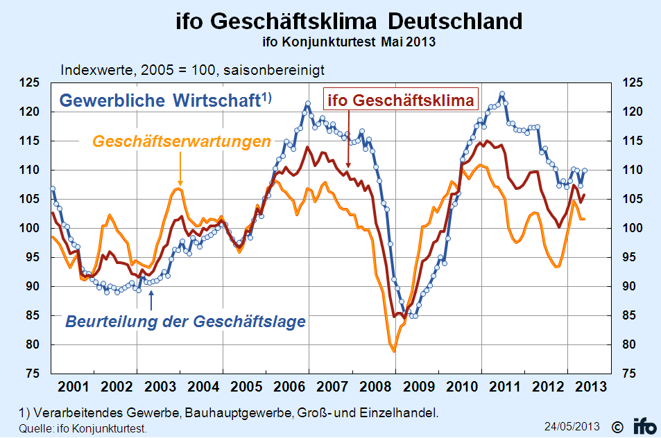Gleichzeitig mit dem positiven Trend des privaten Konsums steigt auch der Geschäftsklimaindex für die gewerbliche Wirtschaft des Münchner Ifo Instituts. Nach zwei Rückgängen in Folge gaben die befragten Unternehmen an, dass sie mit ihrer aktuellen Geschäftslage deutlich zufriedener sind als im Vormonat. Der Ausblick auf den weiteren Geschäftsverlauf bleibt damit unverändert leicht positiv.