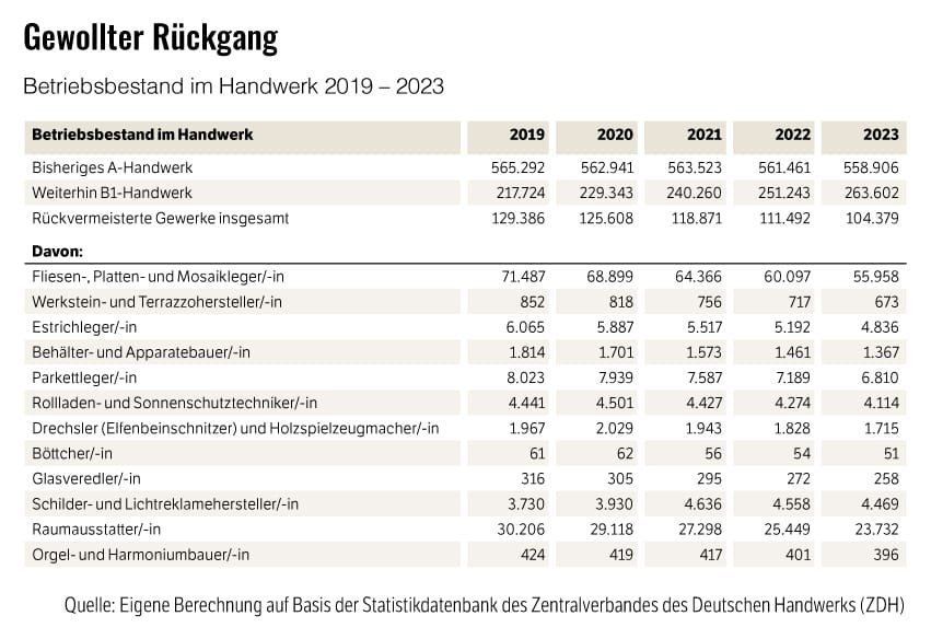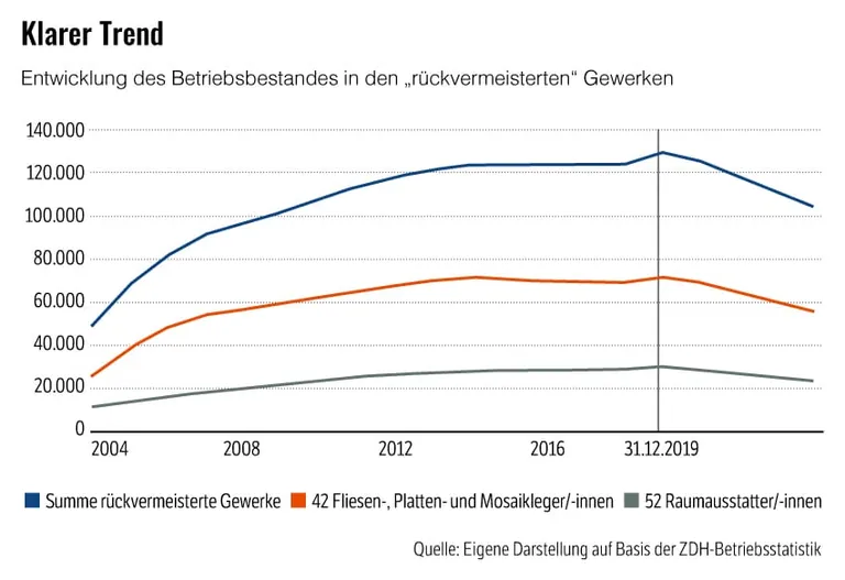 Der Rückgang der Betriebszahlen um 19,3 Prozent von Ende 2019 bis 2023 ist aus Sicht des Handwerks keineswegs negativ zu bewerten, sondern zeigt die gewünschte Marktbereinigung. Von ursprünglich 129.386 Betrieben Ende 2019 blieben 104.379 Ende 2023 bestehen – eine Entwicklung, die zum Marktaustritt unqualifizierter Anbieter beiträgt.