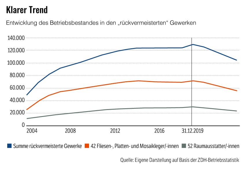 Gleichzeitig stabilisierte sich die durchschnittliche Betriebsgröße in den rückvermeisterten Gewerken und stieg leicht positiv auf durchschnittlich mehr als drei Mitarbeiter. Dies steht im Kontrast zur Entwicklung nach 2004, als ein deutlicher Trend zu Kleinstunternehmen und Soloselbständigen zu beobachten war.
