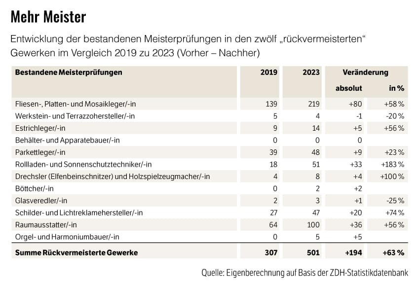 Die Zahlen sprechen eine deutliche Sprache: Die bestandenen Meisterprüfungen in den zwölf rückvermeisterten Gewerken stiegen von 2019 bis 2023 um beeindruckende 63 Prozent – von 307 auf 501 erfolgreich abgelegte Prüfungen. Besonders stark entwickelten sich die Rollladen- und Sonnenschutztechniker mit einem Plus von 183 Prozent sowie die Fliesen-, Platten- und Mosaikleger und Raumausstatter mit jeweils mehr als 50 Prozent Zuwachs.