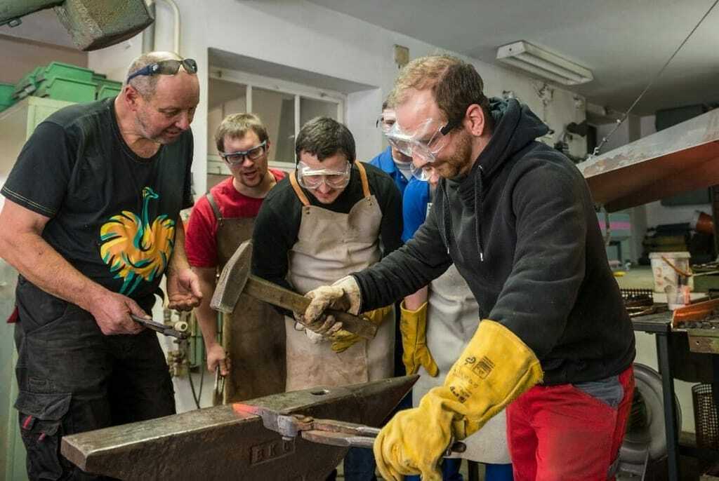 Über die Eigenschaften von Metallen wissen die Azubis aus dem zweiten Lehrjahr am Berufsschulzentrum „Julius Weisbach“ im sächsischen Freiberg schon einiges. Wie sich Stahl bearbeiten lässt, das konnten sie jetzt in der Werkstatt von Gunter Strauß selbst ausprobieren. Unter Anleitung des erfahrenen Schmiedemeisters durften jeweils fünf Lehrlinge in zwei Durchgängen ihr eigenes Messer schmieden.