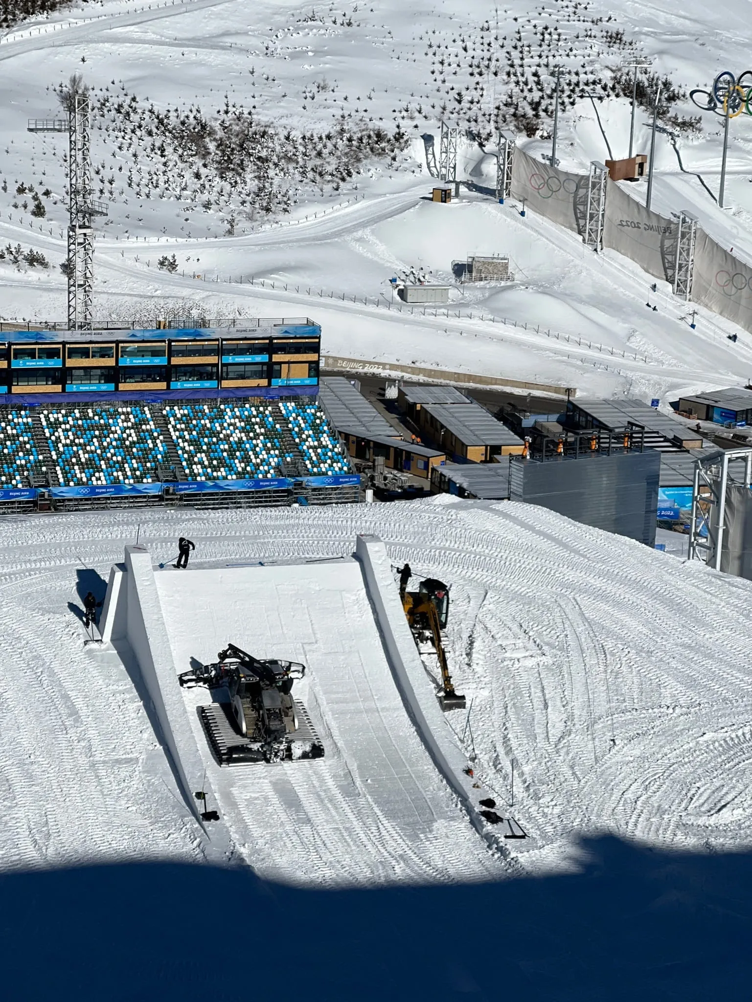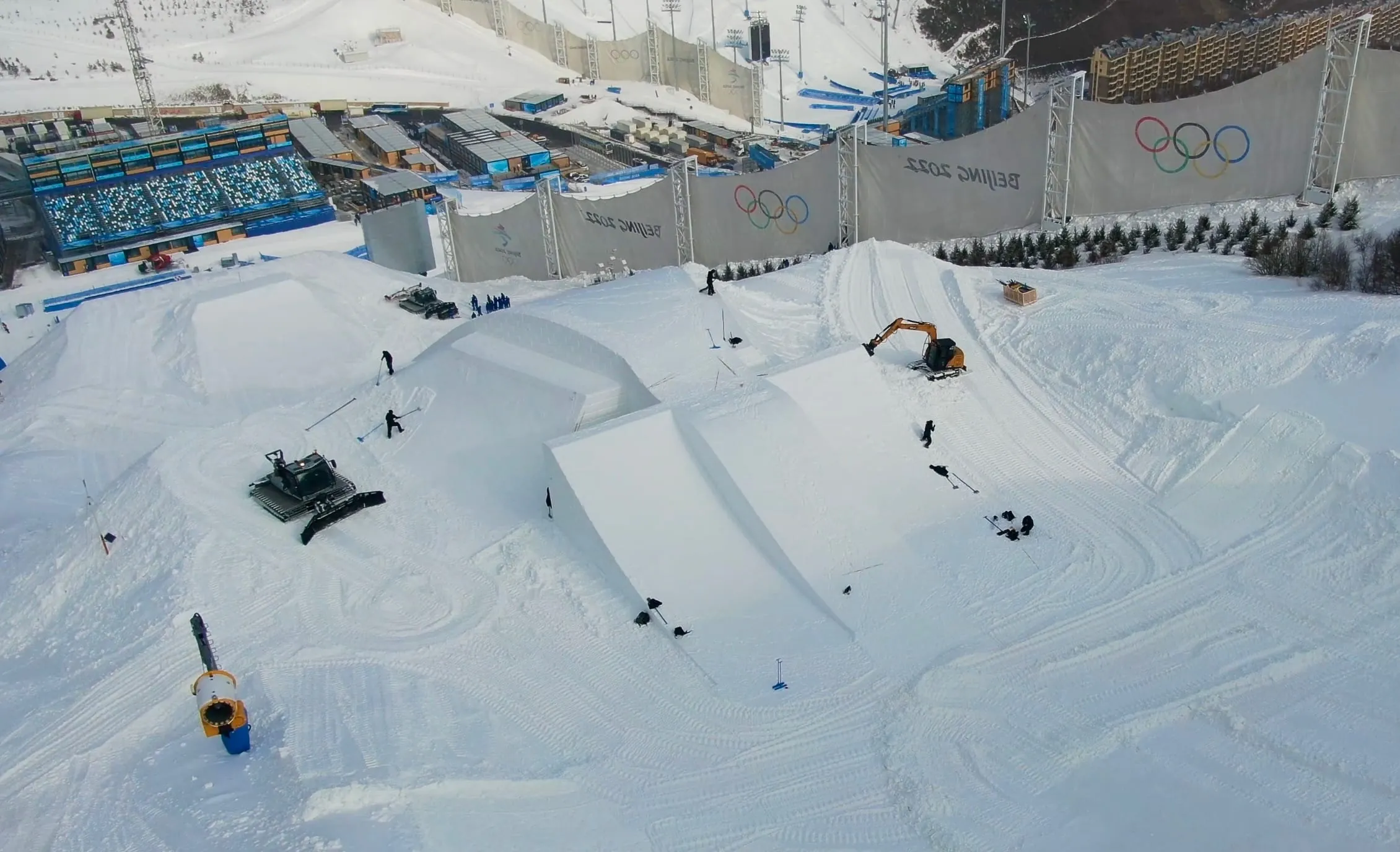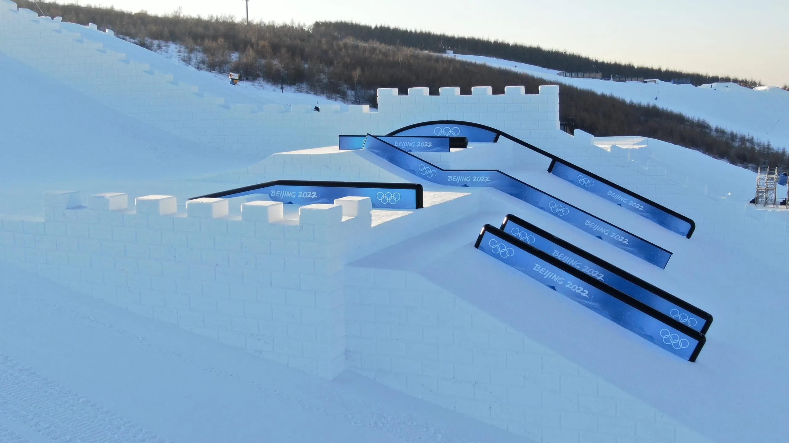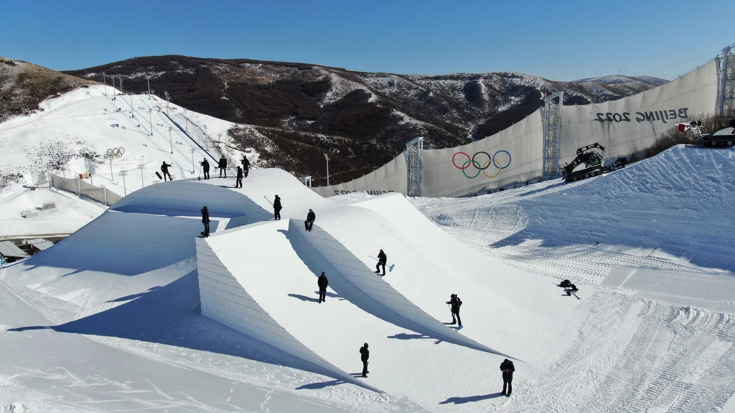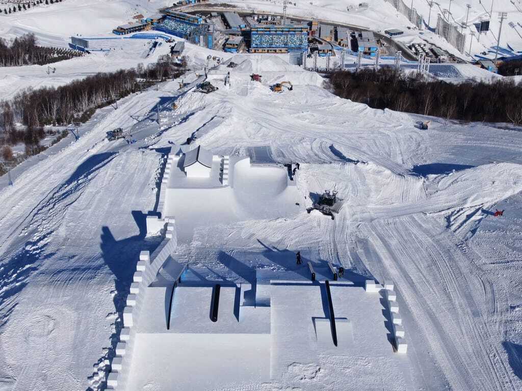 Die Slopestyle- und Big Air-Anlagen für die Olympischen Winterspiele in Peking hat das Handwerksunternehmen Schneestern aus Bayern gebaut. - © Schneestern