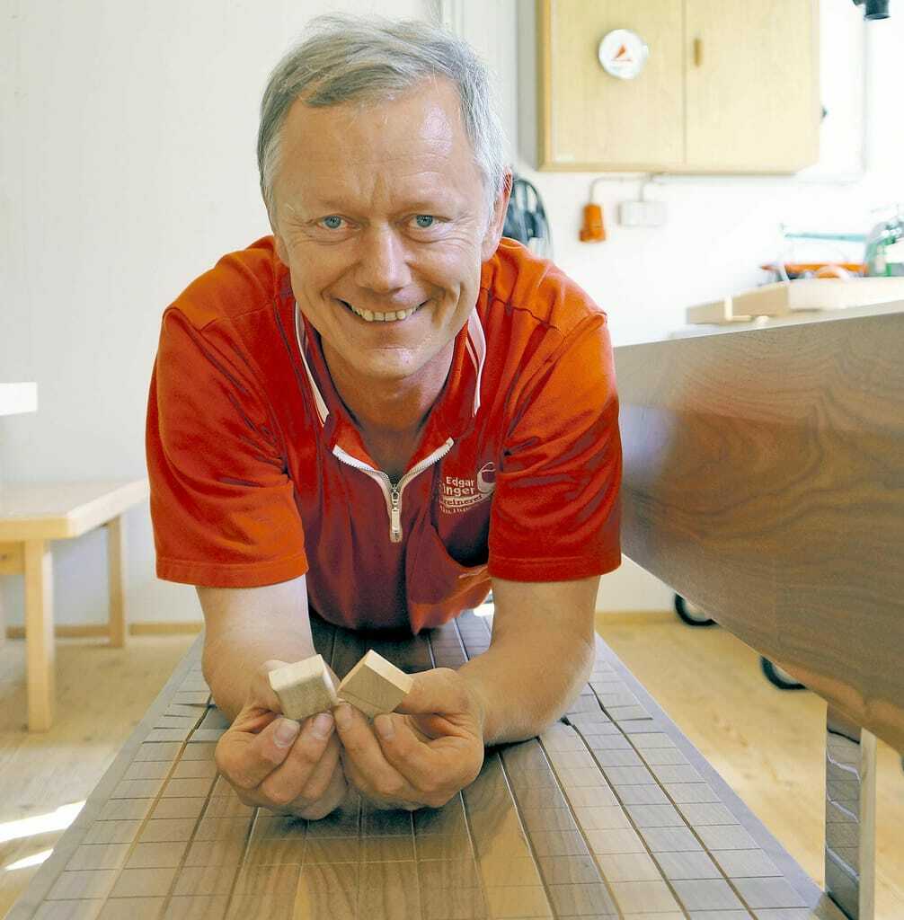 Es sind 480 Holzklötzchen, die dafür sorgen, dass die Nussbaumholzbank von Edgar Seckinger für viele zu einem unerwarteten Sitzerlebnis wird. Der Schreinermeister aus der 6.000-Seelen-Gemeinde Königsfeld im Schwarzwald wollte neue Wege im Sitzmöbelsegment gehen und seine eigene Produktion vorantreiben. Deshalb entwickelte er "Wood Balance": Eine glatte Holzfläche, auf der man wie auf einem weichen Kissen sitzt.