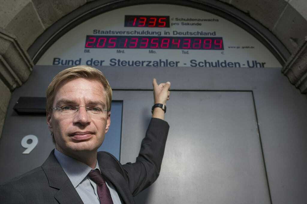 Die Schuldenuhr tickt, trotzdem wird Steuergeld verschwendet. Die schlimmsten Fälle deckt das Schwarzbuch 2014 auf. Bund der Steuerzahler-Präsident Rainer Holznagel stellte es nun in Berlin vor. - © Bund der Steuerzahler