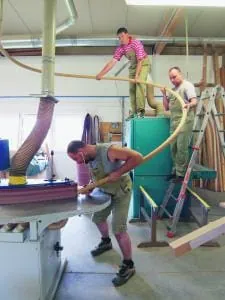 „Immer diese sperrigen Handläufe ...“ von Danny GräfeHier zeigen drei Mitarbeiter von Gräfe Handlaufsysteme aus Bretnig-Hauswalde in der Nähe von Dresden vollen Einsatz. Um das sperrige Bauteil für ein ausgefallenes Spindeltreppengeländer passgenau anzuschleifen, haben sie sich dem Schwung des Handlaufs entsprechend auf umstehenden Schränken und Leitern postiert. Firmenchef Danny Gräfe, der sein Unternehmen auf die Fertigung von Handläufen aller Querschnitte und Verlaufsformen spezialisiert hat, kam im Sommer letzten Jahres zufällig auf dieses hübsche Arbeitermotiv und zückte seine Kamera. Übrigens: Das Teil, das seinem Mitarbeiter aus dem Ohr hängt, ist ein Gehörschutz in Miniformat.Foto: Gräfe