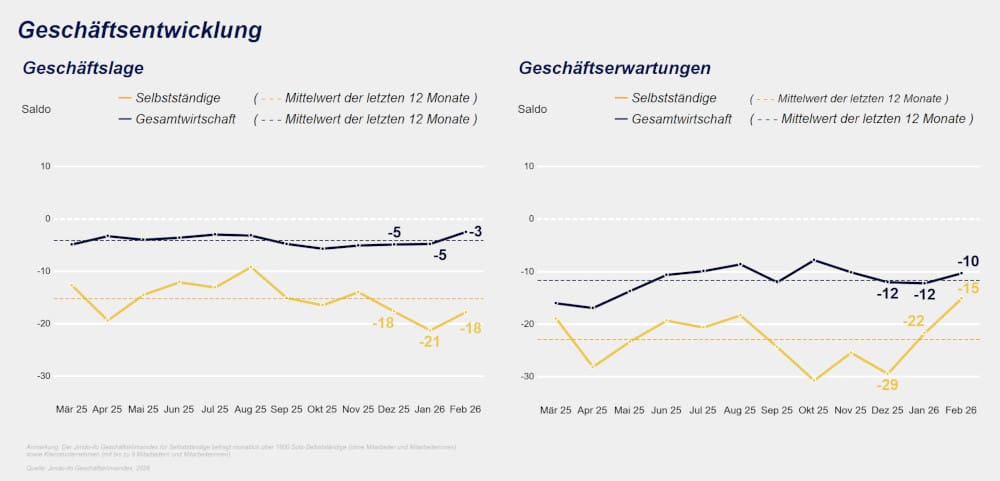 In den ersten Monaten des Jahres steigen die Geschäftserwartungen, weil Projekte starten, Budgets freigegeben und aufgeschobene Investitionen umgesetzt werden. Wie nachhaltig sich dieser Aufbruch dann langfristig im Jahresverlauf entwickelt, bleibt abzuwarten. Dass sich im Februar sowohl die aktuelle Geschäftslage als auch die Aussichten auf die kommenden Monate bei den Soloselbstständigen etwas verbessert haben, werten Wirtschaftsforscher deshalb auch noch nicht als realistischen Aufschwung – oder gar als Trendumkehr.