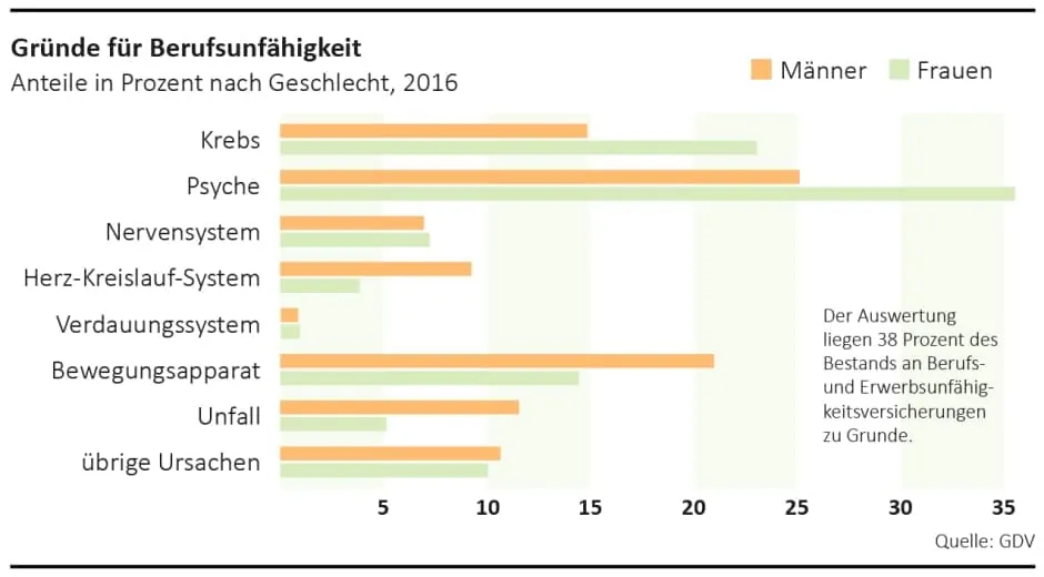 Dabei haben sich die Ursachen für eine Berufsunfähigkeit in den vergangenen Jahren deutlich gewandelt. So waren es früher vor allem körperlich arbeitende Arbeitnehmer, die krankheitsbedingt vor der Rente aus ihrem Job aussteigen mussten. Heutzutage sind laut dem Gesamtverband der Deutschen Versicherungswirtschaft (GDV) die Hauptursachen für eine Berufsunfähigkeit psychische Erkrankungen (siehe Grafik unten), gefolgt von Krebs sowie Erkrankungen des Skelett- und Bewegungsapparats. Unfälle kommen im Übrigen erst an vierter Stelle als Ursache für eine Berufsunfähigkeit.