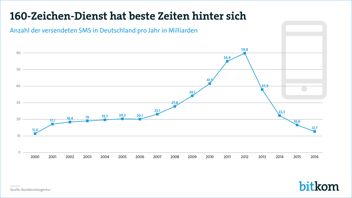 SMS ist die Abkürzung für Short Message Service, auf Deutsch: Kurznachrichtendienst. Mobilfunkanbieter nutzen sie ursprünglich, um ihre Kunden über Netzstörungen zu informieren. Im Jahr 1994 etablierte sie sich als neues Kommunikationsmittel. Die bis zu 160 Zeichen langen Nachrichten sind aus dem modernen Alltag nicht wegzudenken - obwohl es anfangs einige Zweifel am Erfolg gab, mussten die Buchstaben unbequem über die Zahlentastatur eingetippt werden. Doch die goldenen Jahre sind vorbei: Wurden zum 20-jährigen Jubiläum, im Jahr 2012, allein in Deutschland noch 59,8 Milliarden SMS verschickt, waren es im letzten Jahr nur noch 12,7 Milliarden. Der Negativtrend zeigt sich seit 2013.