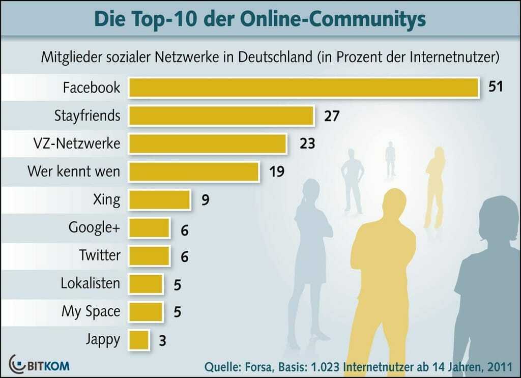 Inzwischen sind fast drei Viertel (74 Prozent) aller Onliner Mitglied in mindestens einer Community, wie die Erhebung des Bundesverbandes Informationswirtschaft, Telekommunikation und neue Medien (Bitkom) belegt. Hinter Facebook auf Platz zwei des Rankings liegt mit einem Anteil von 27 Prozent Stayfriends. Die Community hat sich darauf spezialisiert, alte Mitschülerinnen und Mitschüler wiederzufinden und mit diesen Kontakt zu halten. Auf Platz drei folgen die VZ-Netzwerke StudiVZ, MeinVZ und SchülerVZ, die zusammen 23 Prozent der Internetnutzer erreichen. Die Online-Community "Wer kennt wen" kommt auf 19 Prozent. Das überwiegend für berufliche Zwecke genutzte Netzwerk Xing liegt mit einem Anteil von 9 Prozent auf dem fünften Platz. Google+ konnte sich innerhalb weniger Monate in den Top10 etablieren: 6 Prozent der Onliner sind inzwischen Mitglied des neuen Google-Netzwerks und damit bereits etwa soviele wie bei Twitter.