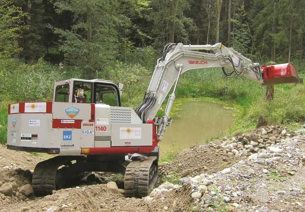 Markus Affentranger aus Altbüron im Kanton Luzern hat einen 16-Tonnen-Bagger von Takeuchi auf Elektroantrieb umgerüstet. Den Strom liefert die Solaranlage auf dem Firmengelände des Bauunternehmers.