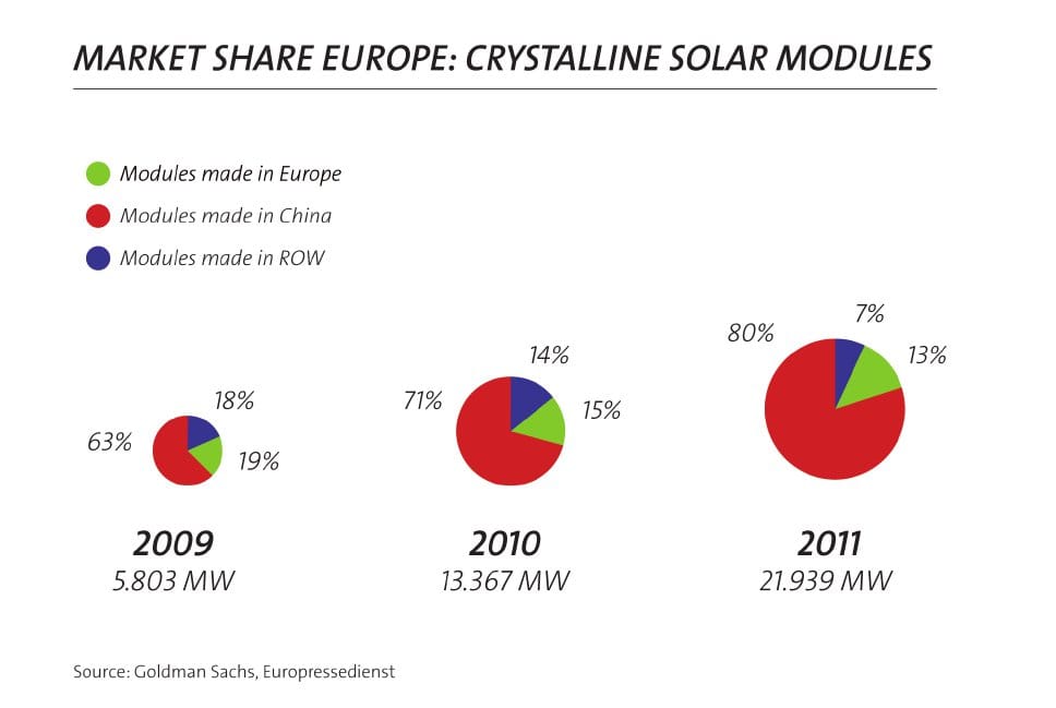 Chinesische Unternehmen haben nach Angaben der Initiative EU ProSun in Europa inzwischen einen Marktanteil von über 80 Prozent erreicht. Dagegen haben allein im laufenden Jahr mehr als zwanzig europäische Solarhersteller Insolvenz anmelden müssen. Die Konkurrenz ist so stark geworden, dass die Solarindustrie hierzulande bei den Preisen nicht mehr mithalten kann.