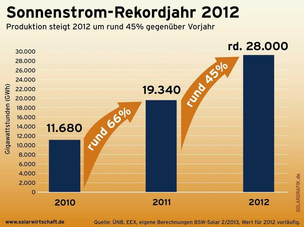 Dass die Treibhausgasemissionen nicht noch weiter angestiegen sind, liegt nach Ansicht des Bundesverbands der Solarwirtschaft (BSW-Solar) aber auch an der stärkeren Nutzung von Sonnenenergie bei der Strom- und Wärmeerzeugung. So hätten dadurch im Jahr 2012 in Deutschland mehr als 19 Millionen Tonnen Kohlendioxid eingespart werden können.