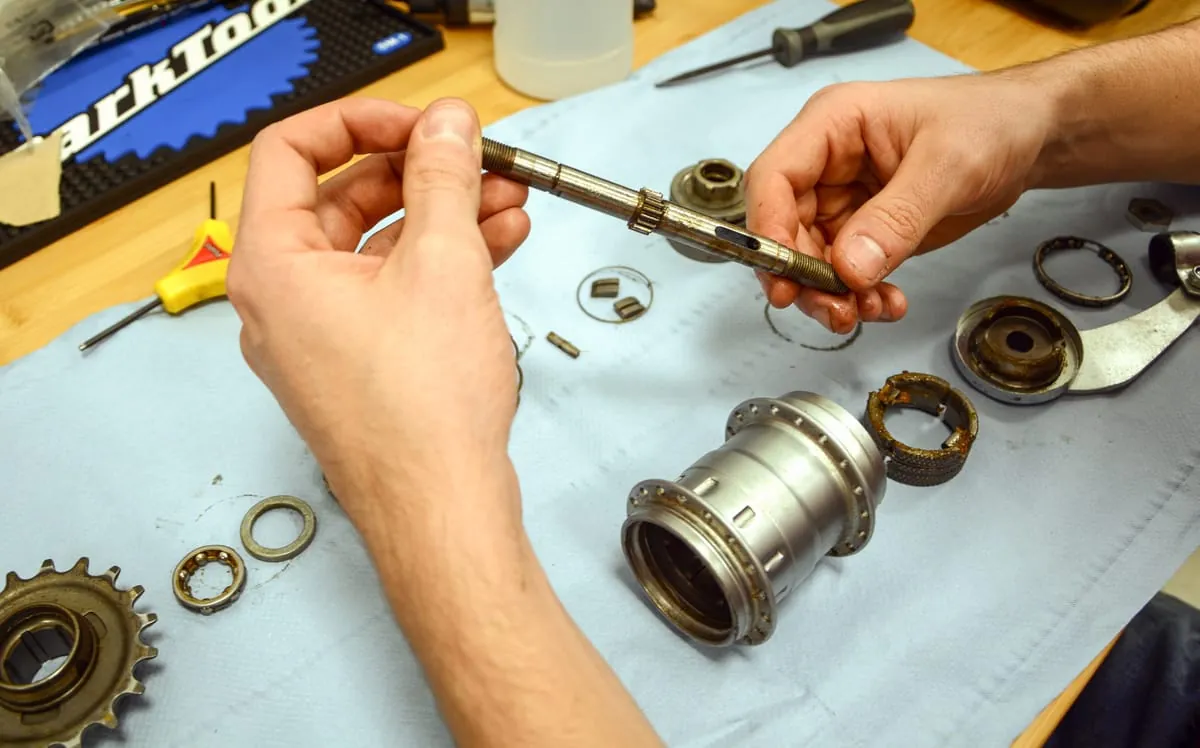 Detailwissen: Kunden bringen gerne ihre alten Fahrradschätze zur Reparatur. Der Zusammenbau einer alten Drei-Gang-Nabe gehört deswegen immer noch zum Standardrepertoire.