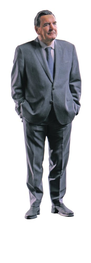 Der Termin in Hannover wird ihr in Erinnerung bleiben: „Schröder war unglaublich diszipliniert und sehr professionell.“ So schnell wie er habe keiner zuvor die Position gefunden, in der er oder sie später als 3D-Figur verewigt werden möchte. Schröder steckte beide Hände lässig in die Hosentaschen, offener, entschlossener Stand und ein klarer Blick nach vorn. Drei Minuten musste er während des Scans stillhalten.