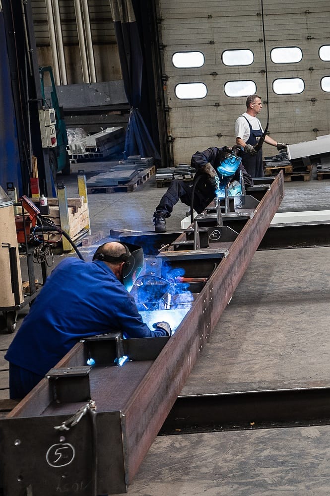 „Ein durchschnittliches Projekt besteht bei uns aus 50 Tonnen Stahl, verteilt auf bis zu 2.000 Einzelteile“, erklärt Produktionsleiter Sebastian Groh. 72 Mitar beiter verar beiten unter seiner Regie in zwei Schichten rund 6.000 Tonnen Stahl pro Jahr. Jeden Monat verlassen zwischen 60 und 70 Lkw mit einer Last von 25 Tonnen den Hof.