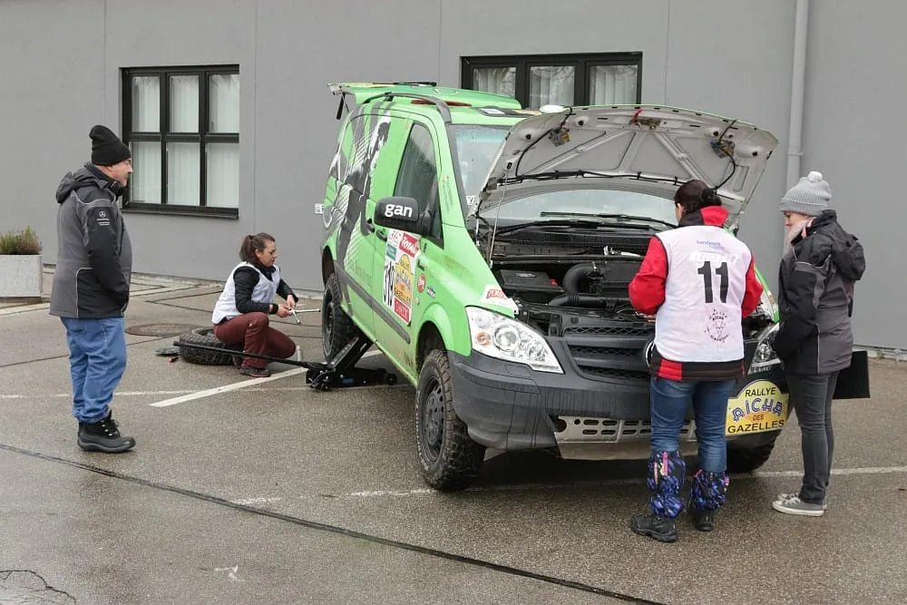 Reifen- und Luftfilterwechsel gehörten wähend der Rallye zum Alltag.