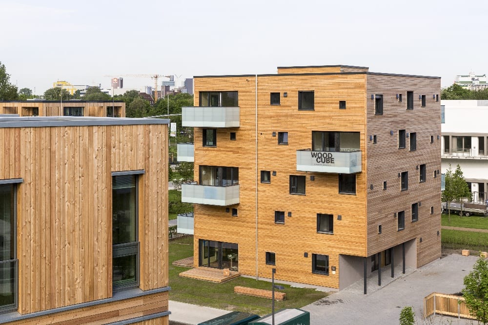 Woodcube HamburgDas Gebäude besteht zu 90 Prozent aus einheimischen Hölzern, deren Brettlagen ausschließlich durch Buchenholzdübel zu 30 cm starken Wand- und Deckenelementen verbunden wurden. Folien, Kleber und Holzschutzmittel kamen ebenso wenig zu Einsatz wie fremdstoffliche Dämmmaterialien, Bauchemie, Lacke oder Kunststoffe. Durch die diffusionsoffene Bauweise wurden zudem Schimmel- und Kondensatbildung ausgeschlossen, lobt die Jury.