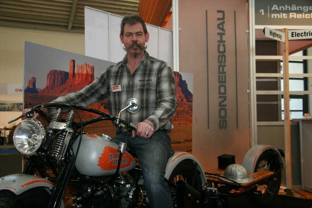 Eigentlich betreiben die beiden Motorradfans eine Fahrschule. Doch als Werkzeugmachermei ster nutzt Andreas Schmidt jede freie Minute, um in seiner Werkstatt an technischen Problemen zu tüfteln. So hat er nicht nur für seine Frau eine Harley Davidson WLA des Baujahrs 1942 mit einigen Raffinessen wie einer offenen Kupplung oder einen in den Tank eingebauten Tacho versehen. In Kooperation mit der Firma "e-bility" entwickelte er einen optisch passenden Hänger für den Elektroroller des Her stellers aus Remagen.