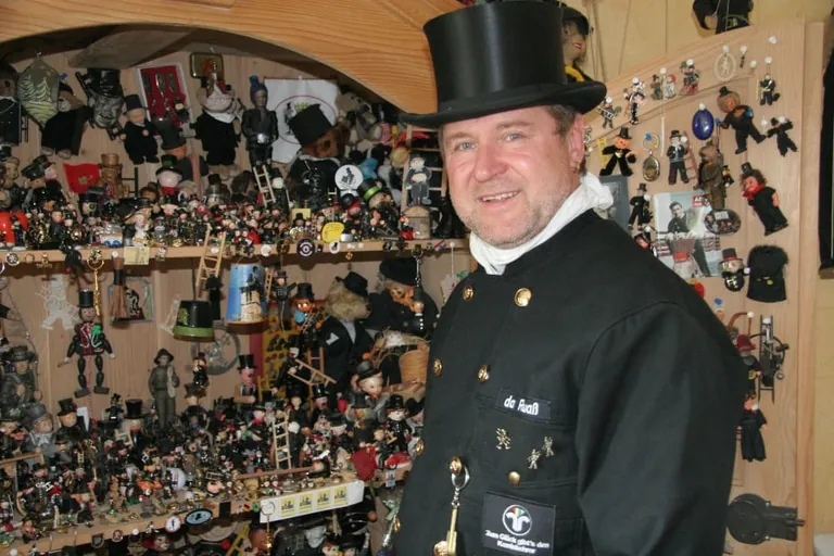 Ehefrau Evelyn kann von der Kaminkehrer-Leidenschaft ihres Mannes ein Lied singen. Zur Hochzeitsfeier musste sie nach Norditalien reisen, um ihrem Zukünftigen während des weltgrößten Schornsteinfegertreffens in der Kirche von Re im Vigezzo-Tal das Ja-Wort zu geben. Für die Hochzeitsfotos ließ sie sich mit ihrem Mann auf Häuser­dächern ablichten. Der Sohn, der ein Dreivierteljahr später geboren wurde, bekam den Namen des Schutzheiligen der Kaminfeger, Florian. „Und wahrscheinlich bin ich die einzige Frau, die keinen richtigen Wohnzimmerschrank hat“, lästert die Gattin. Denn der ist gefüllt mit Kaminkehrerfiguren aller Art, jede für sich ein kleines Glückssymbol.