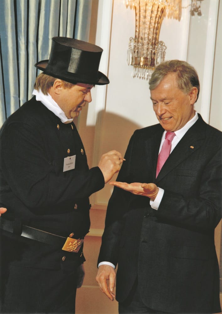 Wie jedes Jahr so ehrte auch Horst Köhler 2009 zum Neujahrsempfang Bürgerinnen und Bürger, die sich in besonderem Maß um das Gemeinwohl verdient gemacht haben. „In meinem Kaminfegergewand war ich so etwas wie der Star unter den Gästen. Die Journalisten haben sich jedenfalls gleich auf mich gestürzt“, erinnert sich Mußner, der für den Bundespräsidenten noch eine besondere Geste in petto hatte. Horst Köhler bekam vom bayerischen Kaminkehrer einen Glücks­pfennig geschenkt, wie schon so viele Menschen, denen der Ruaß begegnet ist.