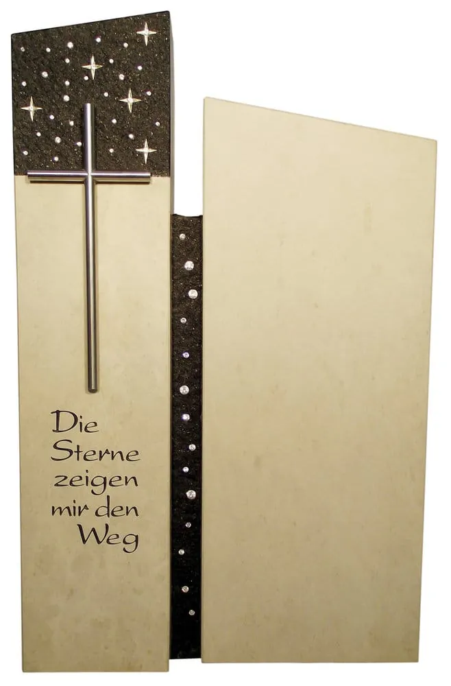 Ein Bestseller aus dem "Rokstyle"-Label: Das Design der Grabsteine setzt unter anderem auf Kristalle und schlichte Elemente wie das Metallkreuz.