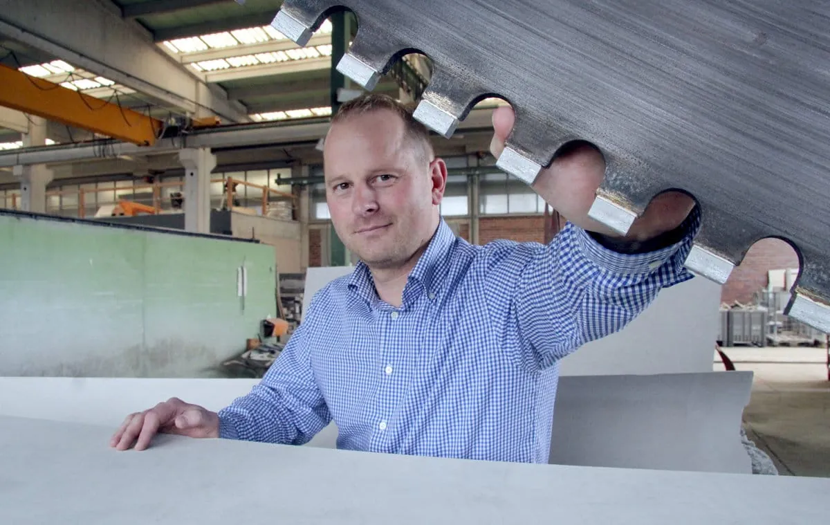 Das Sägen dicker Blöcke: Alexander Hanel an einer früher benutzten Blockkreissäge, die Steinblöcke von bis zu 16 Tonnen ­Gewicht verarbeiten konnte.