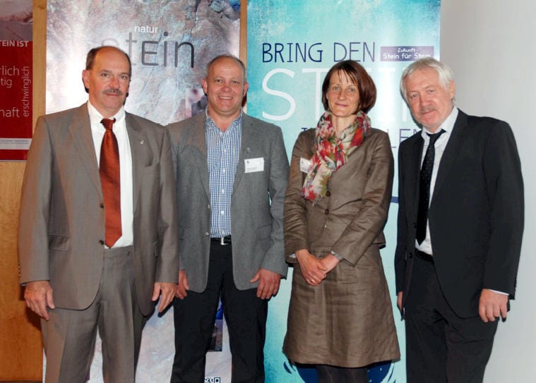 Neue Verbandsspitze (v.l.n.r.): Frank Schuster, Hermann Rudolph (beide stellvertretende Bundesinnungsmeister, die neue Geschäftsfürerin Sybille Trawinski und Bundesinnungsmeister Gustav Treulieb. - © Foto: BIV Steinmetze