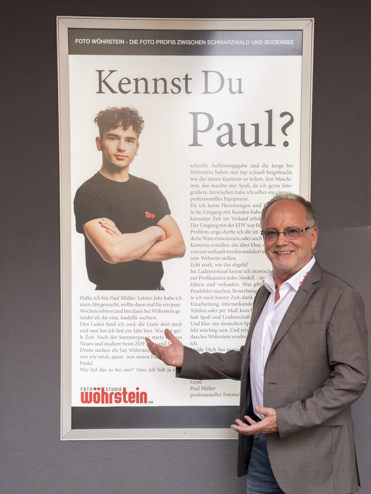'Kennst Du Paul?' Wer durch die Singener Innenstadt läuft, wird am Ladengeschäft von Foto Wöhrstein mit einer seltsam persönlichen Frage konfrontiert. Allzu tief im Gedächtnis muss aber keiner graben, denn auf dem großen LED-Dia an der Fassade stellt sich Paul gleich selbst vor. Genauer gesagt: Paul Müller, seit dem Abi als Aushilfe im Team des Fotospezialisten beschäftigt und kurz vor dem Absprung in ein Filmstudium.