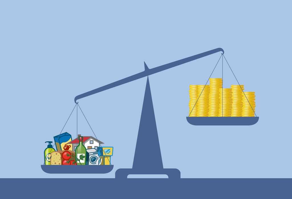 Waage mit Lebensmittel und Geld