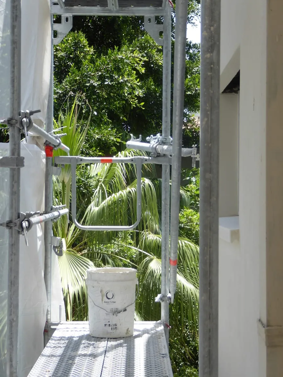 900 Quadratmeter Fassade waren dann bereit für die Maler und Lackierer. Die ebenfalls importierte mineralische Farbe wird nicht aufgerollt, sondern mit Bürsten eingearbeitet. "Die Silikatfarbe trocknet nicht nur auf der Oberfläche, sie verkieselt durch eine chemische Reaktion direkt mit dem Untergrund. Das ergibt eine stärkere Haftung", erklärt Annika Hillegeist. Zwei Schichten trägt das Team über die Grundierung auf. Wegen des schwülwarmen Klimas trocknet die Farbe so schnell, dass Erst- und Zweitschicht oft an einem Tag aufgebracht werden können.