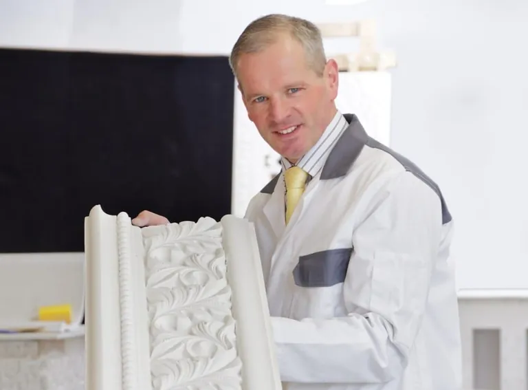 Die Zutaten sind Wasser und Gips. Einfacher geht es eigentlich nicht. Und doch dauerte es sieben Jahre, bis Stuckateurmeister Axel von der Herberg aus Heilbronn seine vollautomatische Stuckproduktionsanlage in Betrieb nehmen konnte. Das war vor drei Monaten.