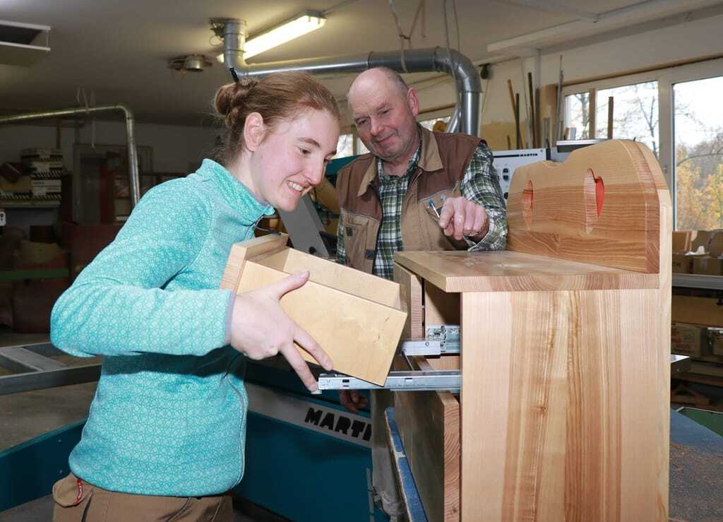 Auch Schreinermeister Gerd Schneider ist vom Talent seiner neuen Auszubildenden überzeugt. "Bevor in meinem Betrieb jemand eine Ausbildung anfängt, lade ich die jungen Leute zum Probearbeiten oder zu einem Praktikum ein. Dabei sieht man sehr schnell ob es passt und eine Lehre funktionieren kann." Bei Lisa war bereits nach einem Tag klar, dass Lehrbetrieb und Auszubildende zusammenkommen. Und kurze Zeit später fühlt sich Lisa als vollwertiges Mitglied in der Werkstatt akzeptiert. "Außerdem bin ich stolz darauf, im Betrieb die 'Henne im Korb' zu sein."