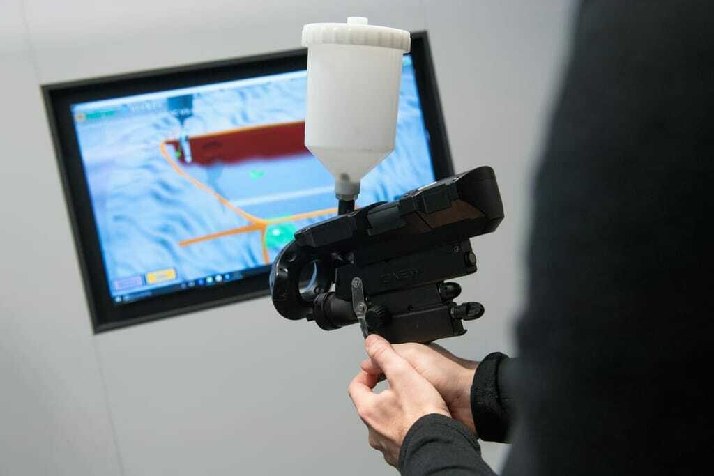 Distanz und Winkel stimmen und ein optimales Arbeitsergebnis erzielt werden kann. Die spätere Analyse der VR-Software deckt Fehler genau auf und zeigt, an welchen Stellen des Werkstücks zu viel oder zu wenig Farbe aufgetragen wurde.