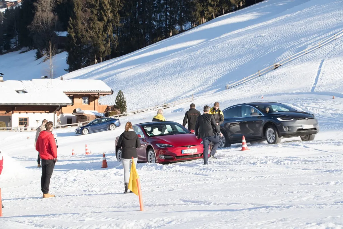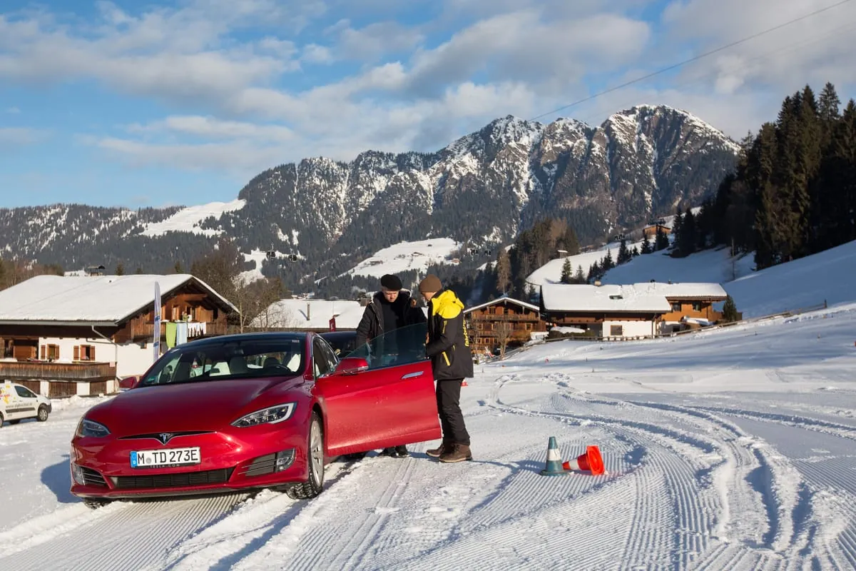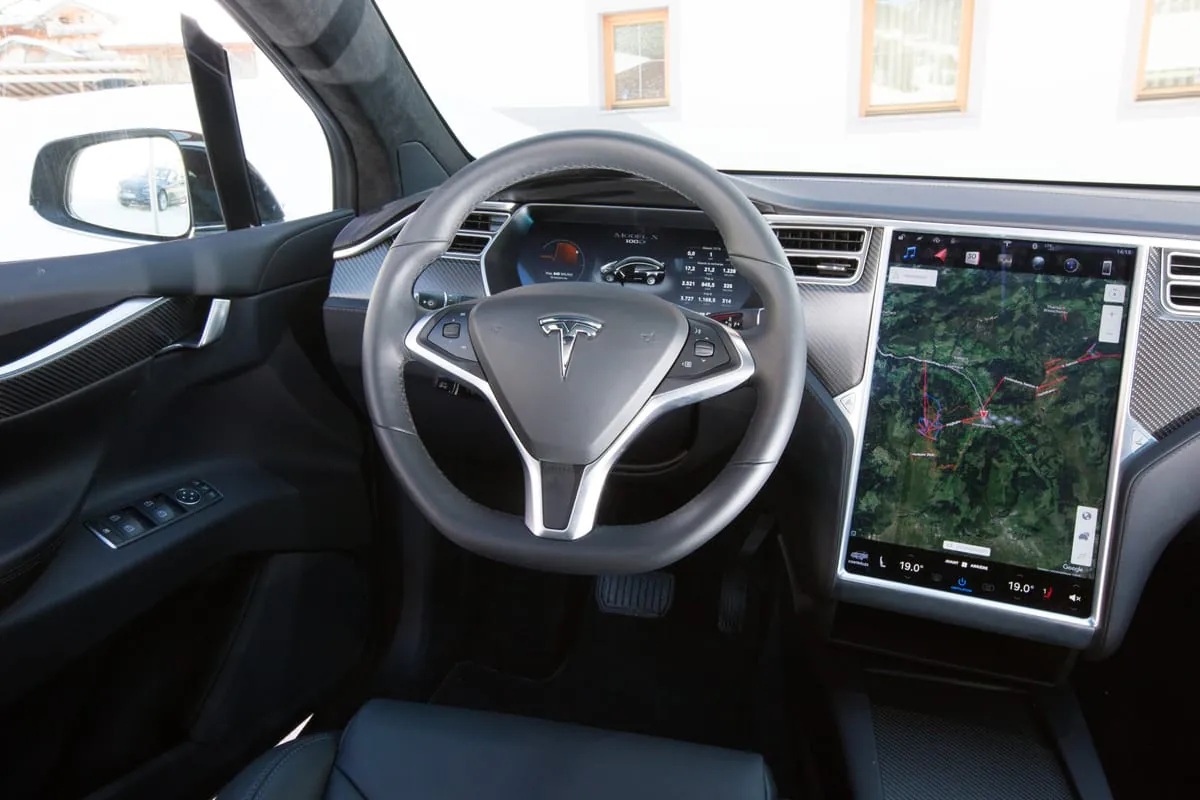 Die Flügeltüren sind aber nicht nur eine schöne Spielerei, sondern wirklich nützlich. Den Mitfahrern wird der Ein- und Ausstieg gerade in schmalen Parklücken deutlich erleichtert. In der vorderen Sitzreihe verzichtet Tesla auf den Flügeleffekt. Ein Extra gibt es für den Fahrer aber doch. Nach dem Einstieg genügt ein kurzer Tritt auf die Bremse und die Tür schließt sich automatisch.