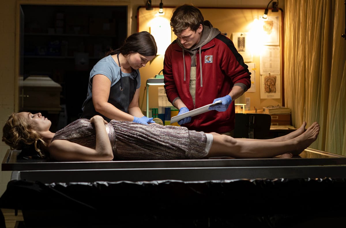 Die Szenen im Bestattungsinstitut lassen sich daher an einer Hand abzählen: Ehe man Lisa die Leiche zur Obduktion wieder wegnimmt, landet sie zwar auf ihrem Tisch – aber über ihr Handwerk erfährt das TV-Publikum wenig. Stattdessen führt Lisa in Profiler-Manier einen seltsamen Dialog mit der Toten, die auffallend gut gekleidet war ( "Wem wolltest du hier in diesem Kaff gefallen?"). Das irritiert selbst ihren Bruder Hannes (Frederik Bott), der als Schreiner seine Brötchen verdient und für den Zuschauer durch das stolz aufgenähte Freischwimmer-Abzeichen und seine Hochwasserhose jederzeit als Dorftrottel zu identifizieren ist ( "Du weißt schon, dass die nimmer antworten kann…?").