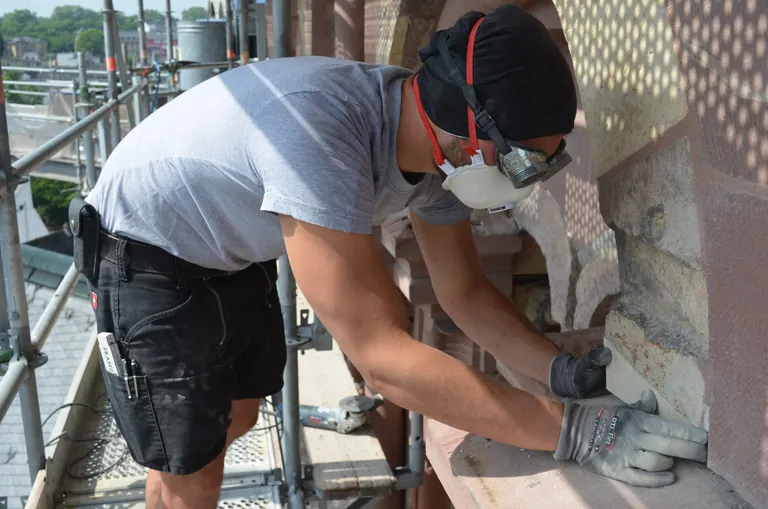 Wie jeden Tag an so einem monumentalen Bauwerk gibt es auch heute reichlich zu tun. Nur über das Baugerüst erreichbar liegt die abgeplatzte Ecke eines Rundbogens in schwindelerregender Höhe und wartet auf Manuels rettende Hände. Eine neue Kalksteinvierung muss eingesetzt werden. Dabei wird das kaputte Stück Kalkstein durch ein Neues ersetzt, ohne den gesamten Stein auszutauschen. "Doch, Sicherheit geht vor", erklärt Manuel mit ernster Miene, während er die FFP3-Maske anlegt und sich die Oropax in Position dreht. "Klassische Steinmetzkrankheiten wie die Maurerkrätze oder die Staublunge dürfen nicht unterschätzt werden", so Manuel weiter, während er sich die Gummihandschuhe überstreift und die Schutzbrille zurechtrückt.