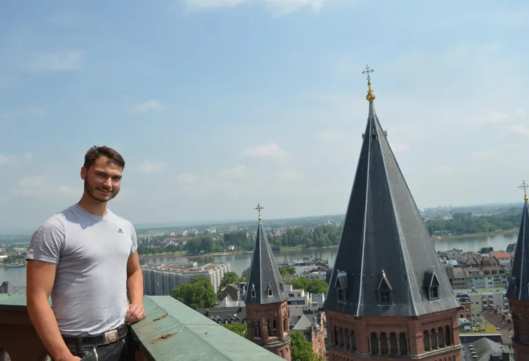 Ein dumpfes, metallisches Geräusch erschallt, als die schwarzen, schweren Sicherheitsschuhe den ersten Schritt auf das Baugerüst setzen. Manuels Blick schweift von der Stadt über den Rhein zurück zum Dom. Das Funkeln in seinen Augen verrät, wäre nicht diese Aussicht, hätte er damals wohl kaum die Lehre zum Steinmetz bei der Mainzer Dombauhütte begonnen. "Ich kann mich an diesem Ausblick einfach nicht sattsehen", sagt der geborene Mainzer zufrieden und spaziert mit souveräner Leichtigkeit über das gelochte Gerüst in Richtung der Sankt Martin Statue. Der Namensgeber des Mainzer Doms benötigt dringend einen neuen Federschmuck, da Witterungseinflüsse das Originalgestein herabstürzen ließen. Nicht nur die Zeit, sondern auch Wind und Wetter nagen an der 1009 n. Chr. erbauten Sand- und Kalksteinfassade.