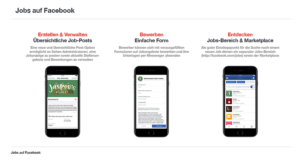 Handwerksbetriebe sollen mit "Facebook Jobs" schneller, einfacher und kostengünstiger neue Mitarbeiter finden als über die klassischen Kanäle. Seitenadministratoren im Betrieb können Jobprofile mit einer Beschreibung der Tätigkeit, der Art (Vollzeit/Teilzeit/Ausbildung o.Ä.) sowie Bezahlung für die Beschäftigung direkt über ihre Seite teilen. Dieser Post erscheint an mehreren Stellen auf Facebook, unter anderem auf der unternehmenseigenen Facebook-Seite, im "Jobs"-Bereich, im Marketplace oder auch im News Feed. Stellenausschreibungen können wie andere Posts einer Business-Seite beworben werden, um gezielt die Aufmerksamkeit passender Bewerber auf sich zu lenken. Die gesamte Kommunikation mit den Jobkandidaten kann im weiteren Verlauf über Messenger wie zum Beispiel WhatsApp geführt werden.