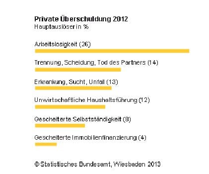 Um die Faktoren der Überschuldungsrisiken herauszubekommen, hat das Statistische Bundesamt Daten der Schuldnerberatungsstellen in Deutschland ausgewertet. Im Ergebnis zeigt sich, dass der Hauptauslöser von Überschuldung immer noch der Verlust des Arbeitsplatzes ist. Er macht 26 Prozent aller Überschuldungsfälle aus.