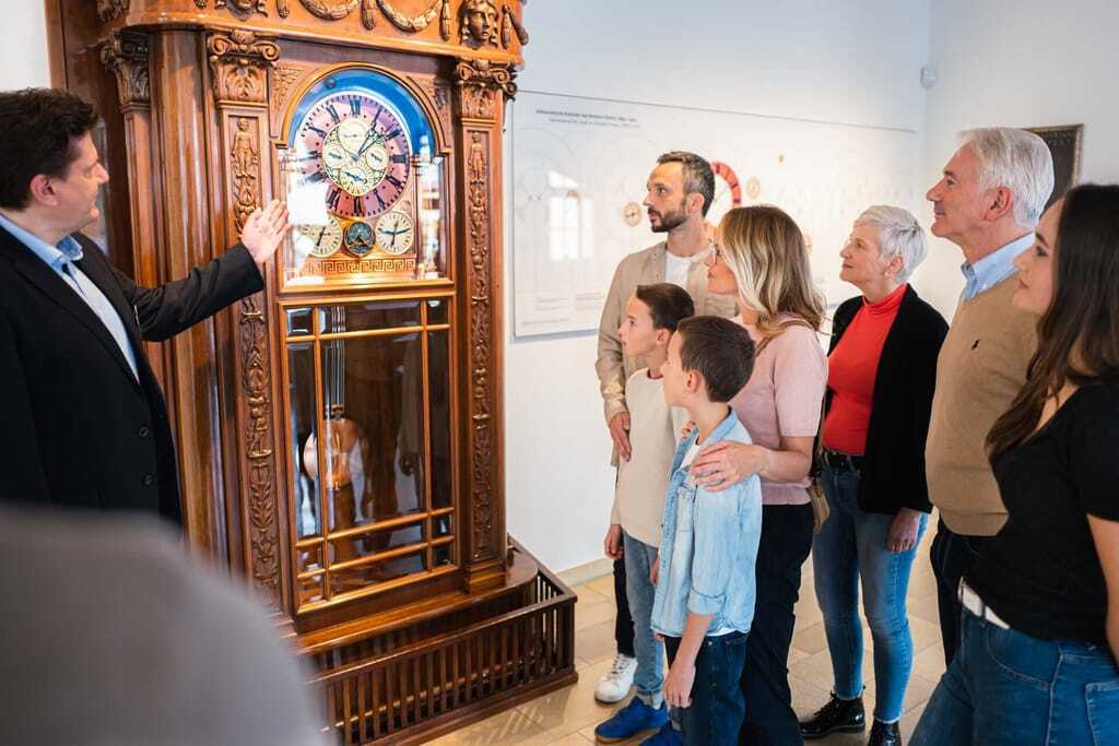 Offiziell heißt das Unternehmen Glashütter Uhrenbetrieb GmbH und gehört zur Schweizer Swatch-Gruppe, die über eine Stiftung das Deutsche Uhrenmuseum unterhält. Gleich hinter dem Eingang empfängt ein Wunderwerk der Technik die Besucher. Die astronomische Kunstuhr von Hermann Goertz, die der Tüftler über Jahrzehnte hinweg aus mehr als 1.700 Einzelteilen gebaut hat, besticht mit 17 Komplikationen. Das öffentliche Aufziehen der 2,5 Meter hohen Standuhr bestaunen jeden ersten Donnerstag im Monat dutzende Gäste aus dem In- und Ausland. Anschließend können sie im Haus wie auf einem Zeitstrahl der Geschichte der Uhrenfabrikation in Glashütte folgen.