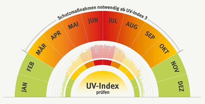 Orientierung, ab wann Maßnahmen für einen UV-Schutz notwendig sind, bietet zudem der UV-Index (siehe Grafik). Er zeigt, dass bereits im März mit zunehmendem Sonnenstand die Belastung durch ultraviolette Strahlung ansteigt. Deshalb sollten Sonnenschutzmaßnahmen bereits im Frühjahr beginnen. Ab einem UV-Index von 3 müssen Schutzmaßnahmen ergriffen werden. Das legt die Technische Regel für Arbeitsstätten ASR A5.1 "Arbeitsplätze in nicht allseits umschlossenen Arbeitsstätten und Arbeitsplätzen im Freien" seit August 2025 fest. Die neue technische Regel bietet nach Angaben der BG Bau eine wichtige Orientierung: "Wer sie einhält, kann davon ausgehen, die Anforderungen der Arbeitsstättenverordnung zu erfüllen."
