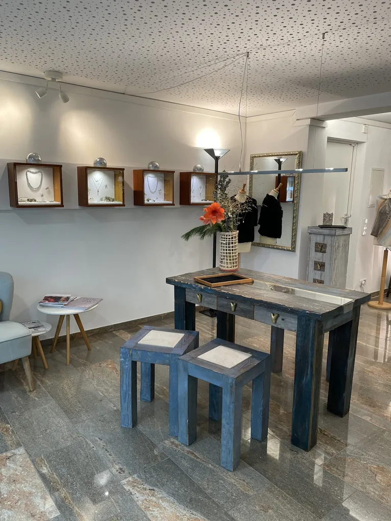 Betritt man den Laden, wird man herzlich von zwei netten Damen begrüßt. Heute stehen Isabell Grosse und Martina Peter-Eckle im Laden. Insgesamt sind es vier Frauen, die die Goldschmiede Delta Schmuckgestaltung betreiben. Der Laden wirkt sehr hell und offen. An den Wänden links und rechts befinden sich kleine Schaukästen aus Holz, welche die Schmuckstücke beinhalten. In der Mitte des Raumes stehen weitere Vitrinen mit Schmuck, ein Tisch mit zwei Hockern und auch ein paar Modepuppen, die den Schmuck präsentieren. Lugt man hinter den Verkaufstresen, welcher am Ende des Verkaufsraumes steht, sieht man auch schon die offene Werkstatt. In der Mitte der Werkstatt steht eine große hölzerne Werkbank.