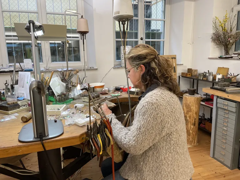 Martina Peter-Eckle hatte schon früh Spaß und Interesse daran, Schmuck selbst zu machen. "Ich habe mir erhofft, dass ich den Beruf später kreativ ausüben kann, nicht nur rein handwerklich, wie das üblich ist bei den Goldschmieden. Denn das Handwerk als Goldschmied bedeutet nicht zwingend, dass man kreativ tätig ist", erklärt sie. "Im Grunde ist es ein handwerklich technischer Beruf. Das heißt, man hat Vorlagen, nach denen man produzieren muss und die Entwurfsarbeit obliegt immer den Designern oder dem jeweiligen Goldschmied, dem der Laden gehört." Das wollte Martina Peter-Eckle nicht. Sie entschied sich nach der Ausbildung noch ein Studium in Schmuckdesign anzuhängen. Dort lernt man unter anderem auch Schmuck zu entwerfen und zu designen. Durch das Studium haben sich die vier Frauen kennengelernt. Drei der Schmuckdesignerinnen haben zuerst die Ausbildung als Goldschmied absolviert und später dann Schmuckdesign studiert. Das Studium ist dabei keineswegs zwingend, aber eine großartige Voraussetzung, den Beruf selbstständig auszuüben.