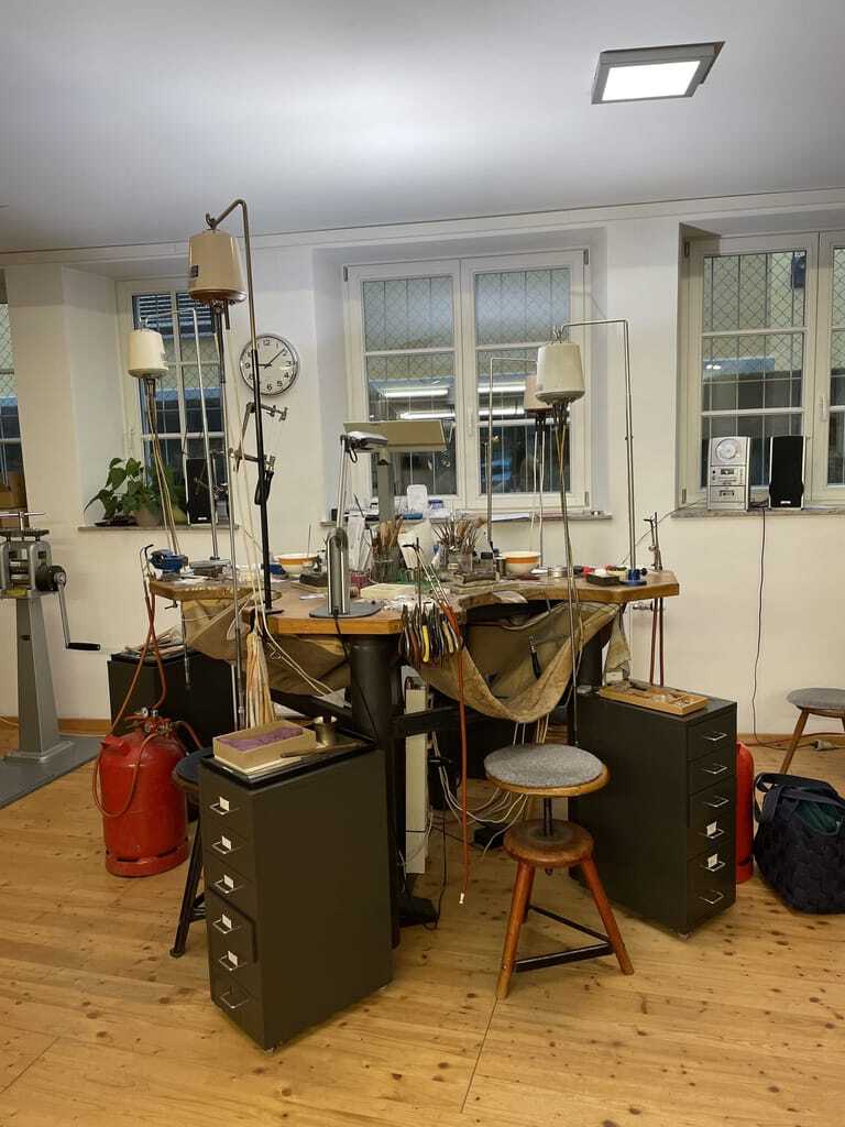 Isabell Grosse setzt sich auf einen runden Holzhocker an ihrem Arbeitsplatz. Das sogenannte Werkbrett ist rund und hat vier Aussparungen für vier Arbeitsplätze. In der Mitte der Aussparung befindet sich der sogenannte Feilnagel. Er besteht aus Holz und dient als Auflagestütze beim Arbeiten. Auf dem Tisch befinden sich Gläser mit verschiedenen Feilen, Schleifwerkzeugen und Zangen, aber auch zahlreiche Edelsteine, Perlen und angefangene Schmuckstücke. "Wir sind ein Betrieb, der mit wenig Technik arbeitet. Wir arbeiten noch relativ rudimentär", erklärt Isabell Grosse. Währenddessen zündet sie mit einem Feuerzeug das Lötgerät an. Vor ihr ist ein dickes Tuch gespannt, das sogenannte Fell, in das die ganzen Reste beim Arbeiten hineinfallen.