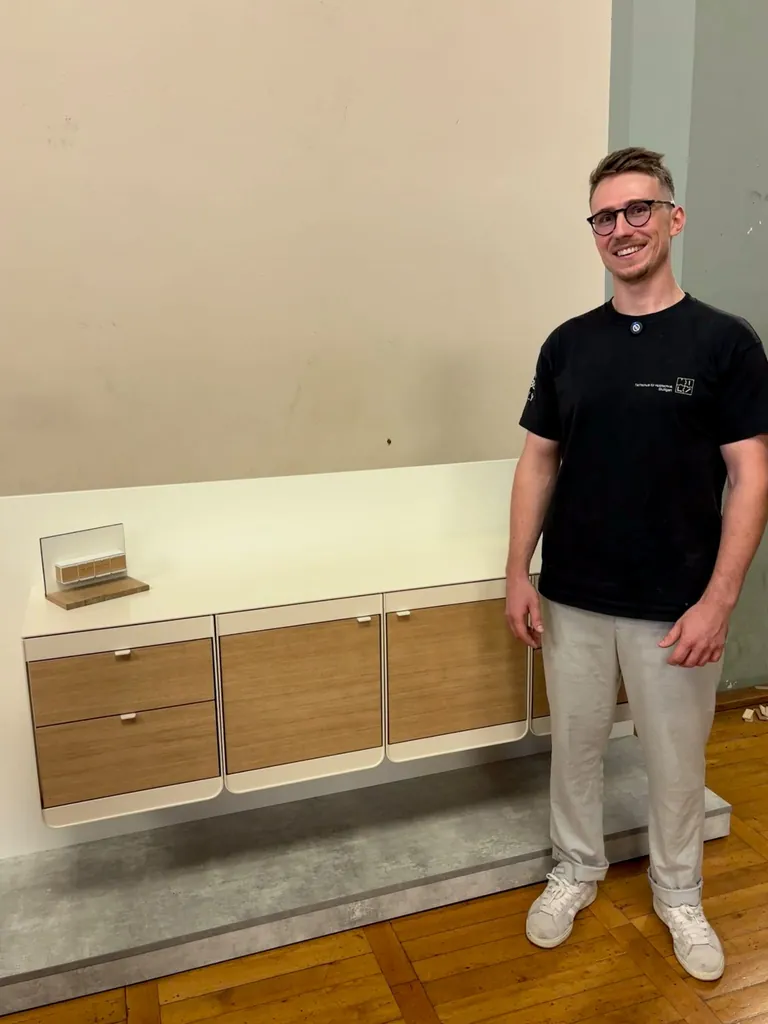 Die Inspiration kam übrigens auf einer Abschlussfeier seines Gestalterjahrgangs: Ein Kollege brachte einen Klappstuhl mit, und Dominik dachte: "Eigentlich schon clever, dass man sich so einfach hinsetzen kann." Aus diesem kleinen Geistesblitz entstand die Grundidee für das Sideboard.
