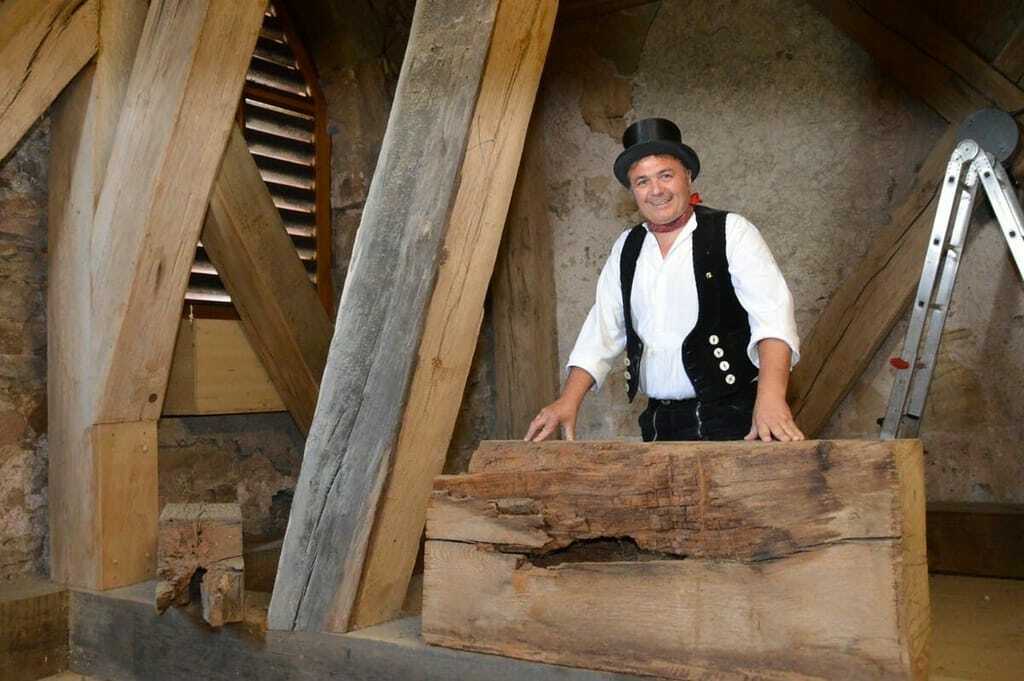 Christian Denz trägt die Zimmermannstracht, so oft es geht. Das Halstuch hat er immer um den Hals gebunden und ohne Zylinder erkennen ihn die Leute nicht. Denz und seine Mitarbeiter ehren alte Handwerks-Traditionen zum Beispiel beim Zimmermannsklatsch. Er liebt Traditionen und seine Region, die mit historischen Bauten gespickt ist. Dies beweist die Auswahl seiner Geschäftsaufträge. Der sanierte Kirchturm ist eines der Wahrzeichen des Hotzenwalds. Danach restaurierten Denz und seine Mitarbeiter die historische Rheinbrücke in Bad Säckingen – die längste überdachte Holzbrücke Europas. Die Zimmerer schwebten bei den Arbeiten fünf bis sechs Meter über dem Rhein. Auch den Dachstuhl des alten Gefängnisses in Bad Säckingen sanierte Denz. Historische Gebäude bringen ihn ins Grübeln. Dann stellt er sich vor, was an diesen Orten wohl passiert sein könnte.