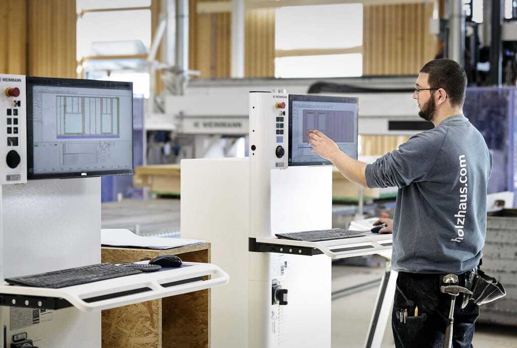 Ein Mann steht vor einem Bildschirm in einer Fertigungshalle für Holzhäuser.